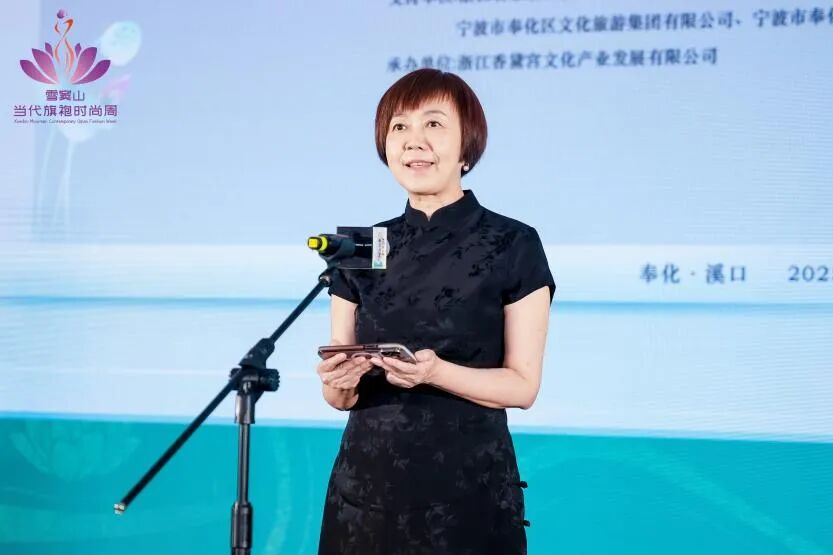 中国纺织工业联合会副会长阎岩在开幕致辞中深入阐释了旗袍的文化价值与时代意义。她指出:“旗袍是中国传统服饰文化的璀璨结晶,当前我国正迈向高质量发展与文化强国建设新征程,人民对高品质、高文化内涵的时尚消费需求日益提升。旗袍作为兼具文化传承与时尚创新的特色品类,迎来前所未有的发展机遇。本次时尚周选址宁波溪口,正是对红帮裁缝百年匠魂的致敬,也是对国风服饰当代发展路径的深刻探索。”