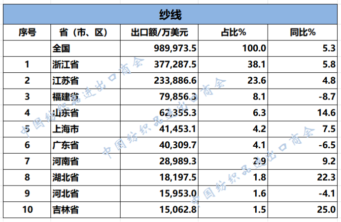 2025年1-8月,我国纺织服装累计出口1973.02亿美元,同比下降0.2%。浙江省、江苏省、广东省、山东省、福建省分别列全国纺织服装出口省市前五位,合计比重超七成。