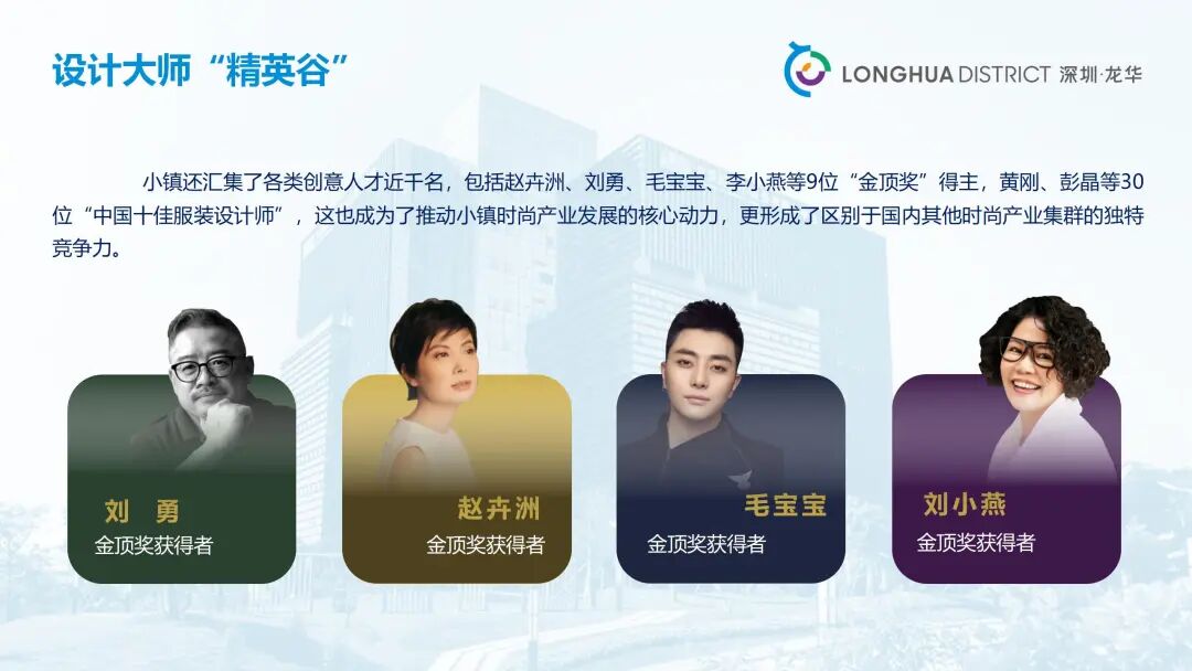 位于龙华区西北部的大浪时尚小镇是现代时尚产业的主阵地,规划面积11.97平方公里,产业核心区1.08平方公里,拥有22个时尚园区,释放优质产业空间150万平方米,超700家时尚企业与300个自主品牌。小镇凭借浓厚的时尚氛围,先后举办深圳米兰双城时尚周、“大浪杯”中国女装设计大赛等活动,深度参与联动深圳时装周、深圳文博会等重量级活动,成为国际化时尚高地。小镇还汇集了各类创意人才近千名,包括赵卉洲、刘勇、毛宝宝等9位中国时装设计“金顶奖”获得者,“中国最佳男装设计师”黄刚,以及彭晶等30位“中国十佳服装设计师”,形成了以“金顶奖”大师为引领、以“中国十佳时装设计师”为中坚力量、以“青年设计师”为新锐力量的多层次设计师人才体系,成为推动小镇时尚产业发展的核心动力,形成了区别于国内其他时尚产业集群的独特竞争力。