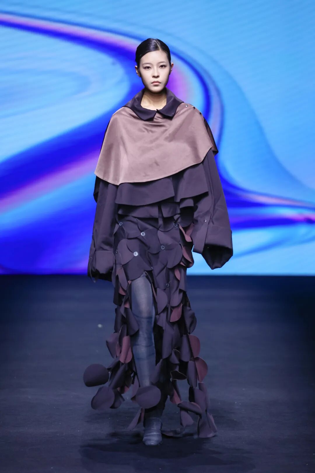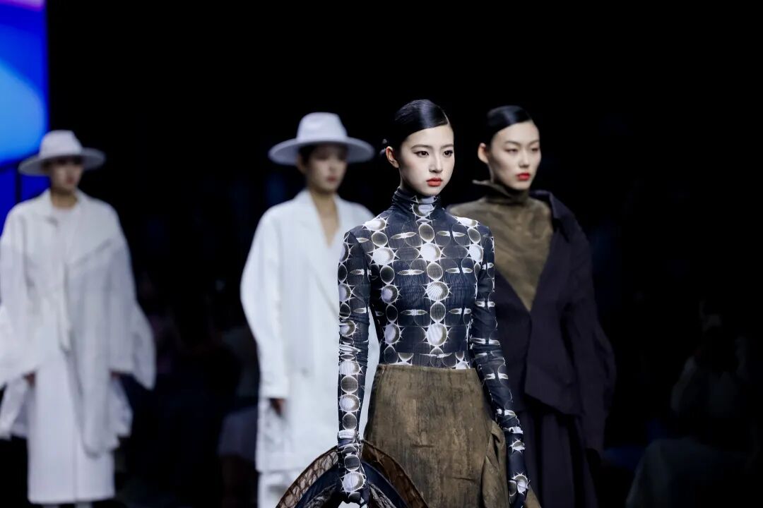 当一阵阵电子音浪与灯光精准同步,第十四届“大浪杯”中国女装设计大赛获奖作品亮相眼前,瞬间引爆全场。这些创作者的设计逻辑成熟完整,敏锐聚焦于玉兰、柳编、麦穗、皮影、窗格等传统文化中“小而美”的具象元素,积极探索材质边界,从天然矿石、泥塑土坯等非传统领域汲取灵感,注重工艺研究与穿着体验,成功将跨界材料融入设计,实现创意与商业的无缝衔接。设计师们积极践行“零浪费”可持续理念,通过重塑废弃布料、二次创作编织袋、回收闲置衣物及快递纸箱等方式,研发新型面料,最大化实现废料活化与资源再利用,展现年轻一代对可持续时尚的担当。